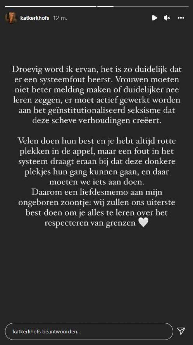 Ook Kat Kerkhofs, die zwanger is van haar eerste kind, fronste haar wenkbrauwen toen ze John de Mol die bewuste uitspraak hoorde doen. De 33-jarige ‘Dancing with the Stars’-presentatrice uitte haar ongenoegen daarover in een Instagrambericht. «Droevig word ik ervan. Het is zo duidelijk dat er een systeemfout heerst. Vrouwen moeten niet beter melding maken of duidelijker nee leren zeggen, er moet actief gewerkt worden aan het geïnstitutionaliseerd seksisme dat deze scheve verhoudingen creëert».