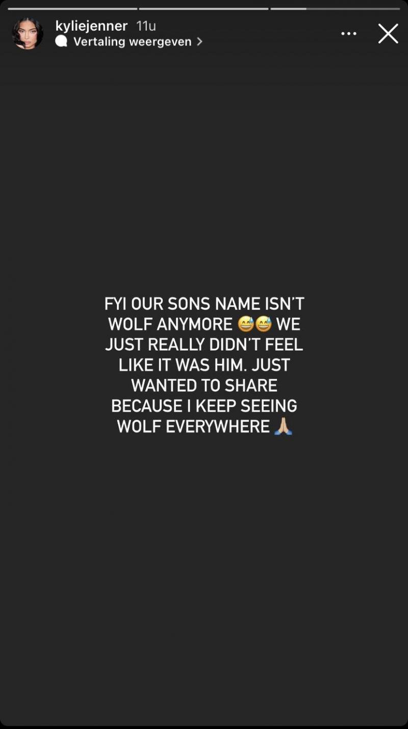 «Even voor jullie informatie, de naam van onze zoon is niet langer Wolf. We hadden gewoon niet het gevoel dat deze naam bij hem paste. Ik wilde dit even delen omdat ik de naam Wolf overal zie», schreef Kylie in een Instagram Story.