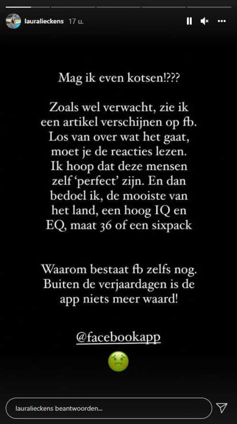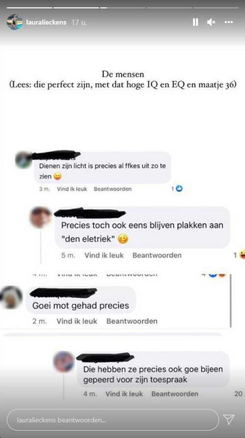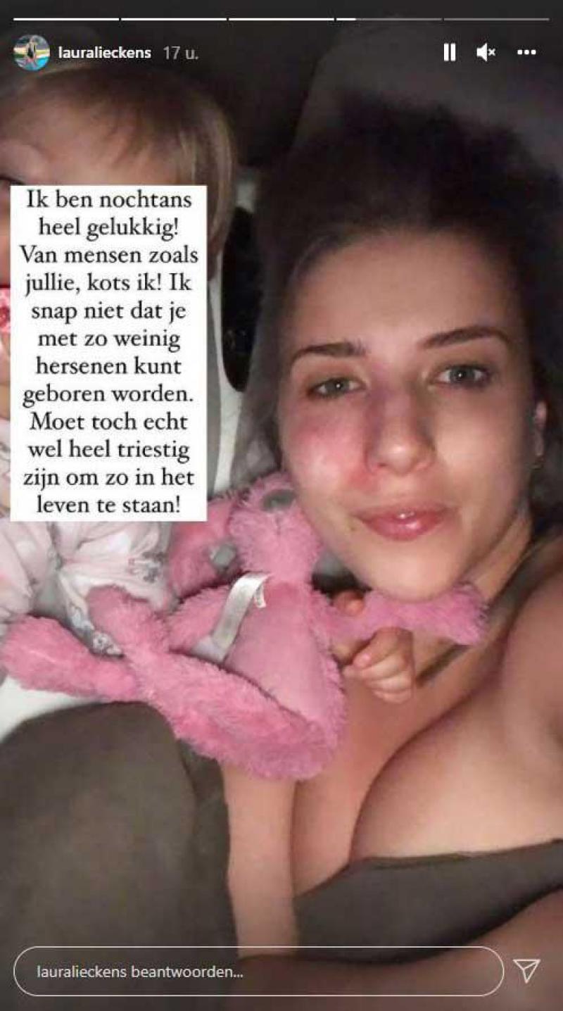 Laura deelde enkele van die reacties en liet weten dat ze er gedegouteerd door is. «Ik ben nochtans heel gelukkig! Van mensen zoals jullie kots ik! Ik snap niet dat je met zo weinig hersenen kunt geboren worden. Moet toch echt wel heel triestig zijn om zo in het leven te staan», schrijft ze op Instagram.