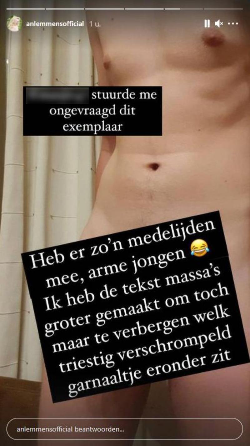 Enkele maanden geleden maakte An Lemmens duidelijk dat het gedaan moet zijn met berichten en naaktfoto’s krijgen van opdringerige mannen. «Kotsbeu ben ik het, de dagdagelijkse geile berichten van mannen die me per se moeten melden wat ze met me willen doen of wat ik in hun fantasieën met hen uitsteek. De gore naaktfoto's. Weet dat ik jullie partner op de hoogte breng. Jullie triestige foto's op het politiebureau belanden. Het gaat zelfs verder dan geen respect hebben. Het is een totale overtreding van je grenzen en je intimiteit», schreef ze op Instagram.