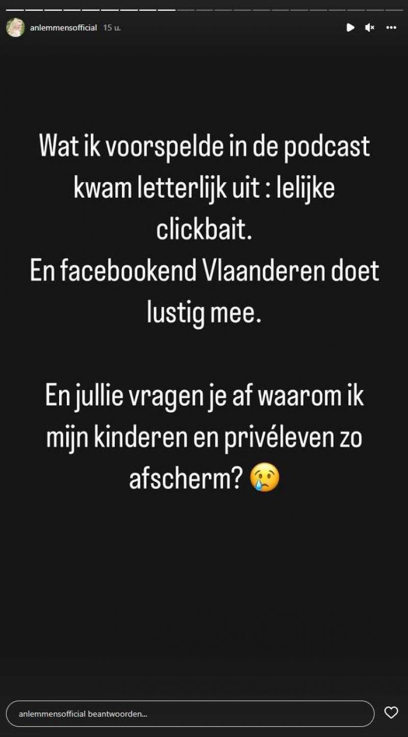 De 42-jarige ‘The Voice Kids’-presentatrice betreurt dat ten zeerste in een verhaal op Instagram. «Wat ik voorspelde in de podcast kwam letterlijk uit: lelijke clickbait. En facebookend Vlaanderen doet lustig mee. En jullie vragen je af waarom ik mijn kinderen en privéleven zo afscherm?», klinkt het.