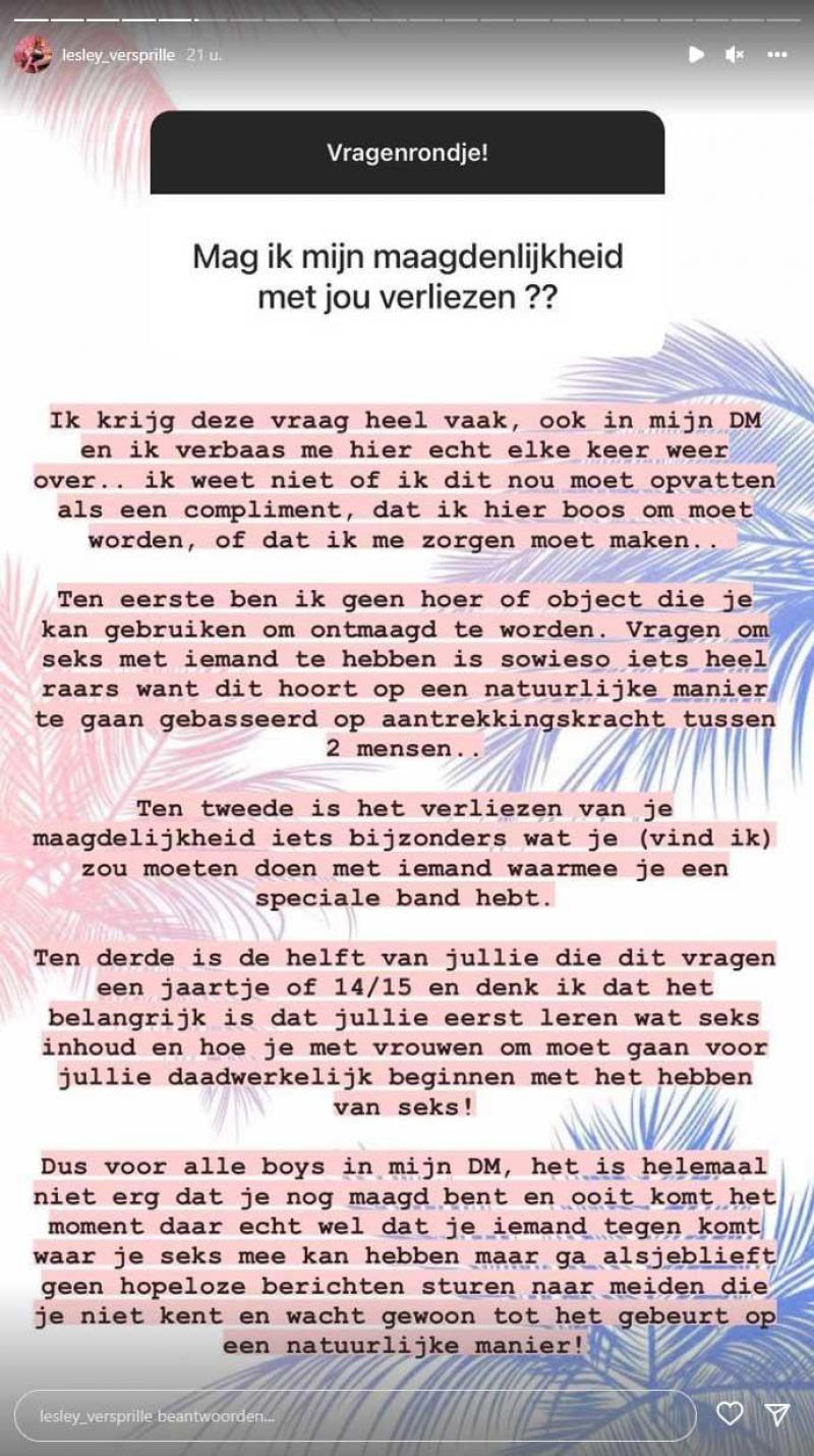 De 25-jarige Nederlandse brunette hield gisteren een vragenuurtje op Instagram. Eén van haar volgers vroeg of hij zijn maagdelijkheid mocht verliezen bij haar. Lesley maakte duidelijk dat het niet de eerste keer is dat ze die vraag krijgt, dus nam ze de tijd om er een gepast antwoord op te geven. «Ik krijg deze vraag heel vaak en ik verbaas me er elke keer weer over. Ik weet niet of ik dit nu als een compliment moet opvatten, dat ik hier boos om moet worden, of dat ik me zorgen moet maken», steekt ze van wal.
