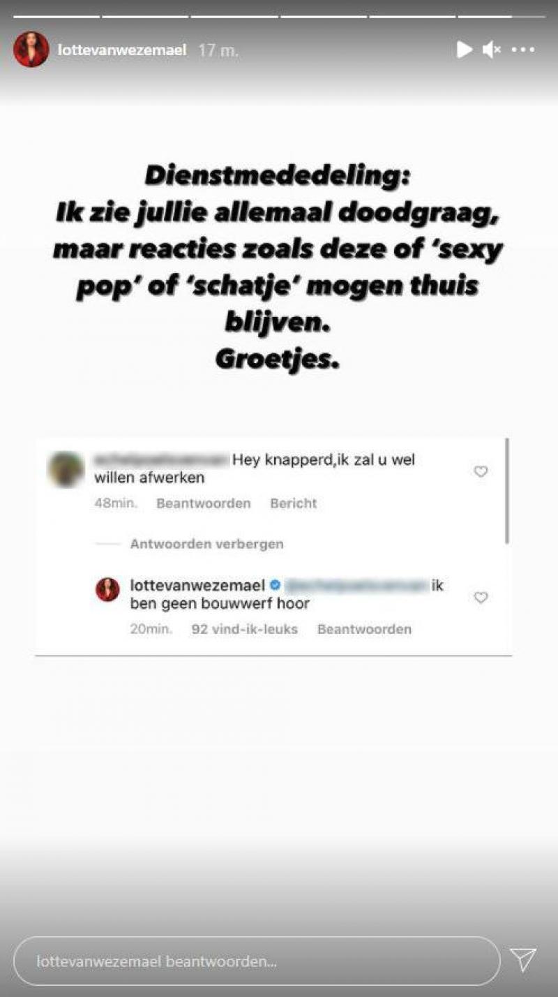Niet oké, dus reageerde Lotte met een gepast antwoord. «Ik ben geen bouwwerf hoor», klonk het. Ze deelde de bewuste reactie en roept mensen op om dergelijke zaken voor zich te houden. «Dienstmededeling: ik zie jullie allemaal doodgraag, maar reacties zoals deze of ‘sexy pop’ of ‘schatje’ mogen thuis blijven. Groetjes», schrijft ze.