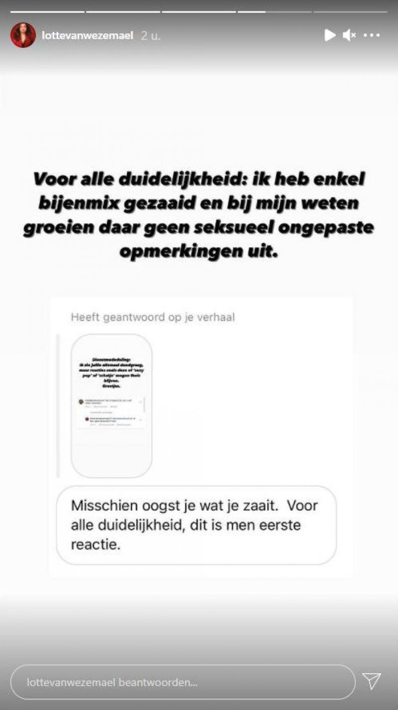 Nadien reageerde nog iemand anders op haar reactie. «Misschien oogst je wat je zaait», klonk het. Ook dat liet Lotte niet zomaar passeren. «Voor alle duidelijkheid: ik heb enkel bijenmix gezaaid en bij mijn weten groeien daar geen seksuele opmerkingen uit», antwoordt ze.