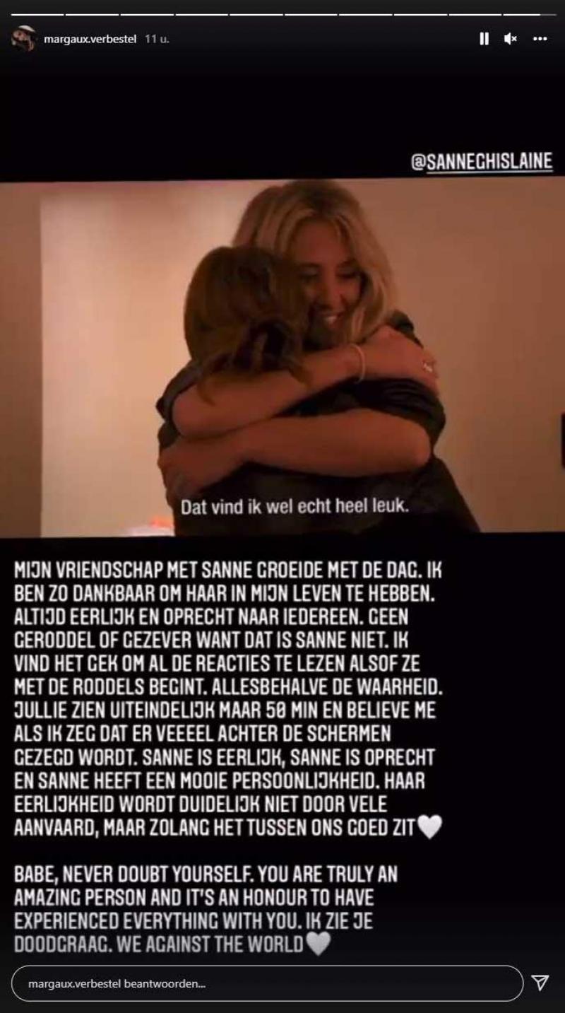Margaux vindt die kritiek onterecht en kaartte dat aan op Instagram. «Sanne is altijd eerlijk en oprecht naar iedereen. Geen geroddel of gezever, want dat is Sanne niet. Ik vind het gek om al de reacties te lezen alsof ze met de roddels begint. Allesbehalve de waarheid. Jullie zien uiteindelijk maar 50 minuten en geloof me als ik zeg dat er veel achter de schermen gezegd wordt. Sanne is eerlijk, Sanne is oprecht en Sanne heeft een mooie persoonlijkheid. Haar eerlijkheid wordt duidelijk niet door velen aanvaard, maar zolang het tussen ons goed zit...», klinkt het.