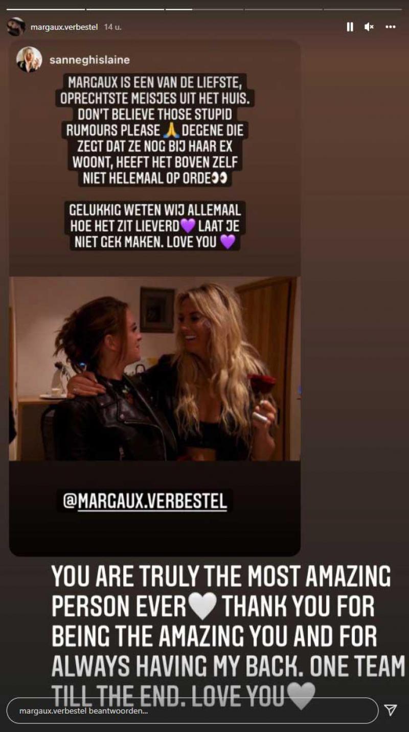 Ook Sanne neemt het op voor de 21-jarige communicatiestudente. «Margaux is één van de liefste en oprechtste meisjes uit het huis. Geloof die stomme roddels alsjeblieft niet. Degene die zegt dat ze nog bij haar ex woont, heeft het boven zelf niet helemaal op orde. Gelukkig weten wij allemaal hoe het zit lieverd. Laat je niet gek maken», klinkt het.