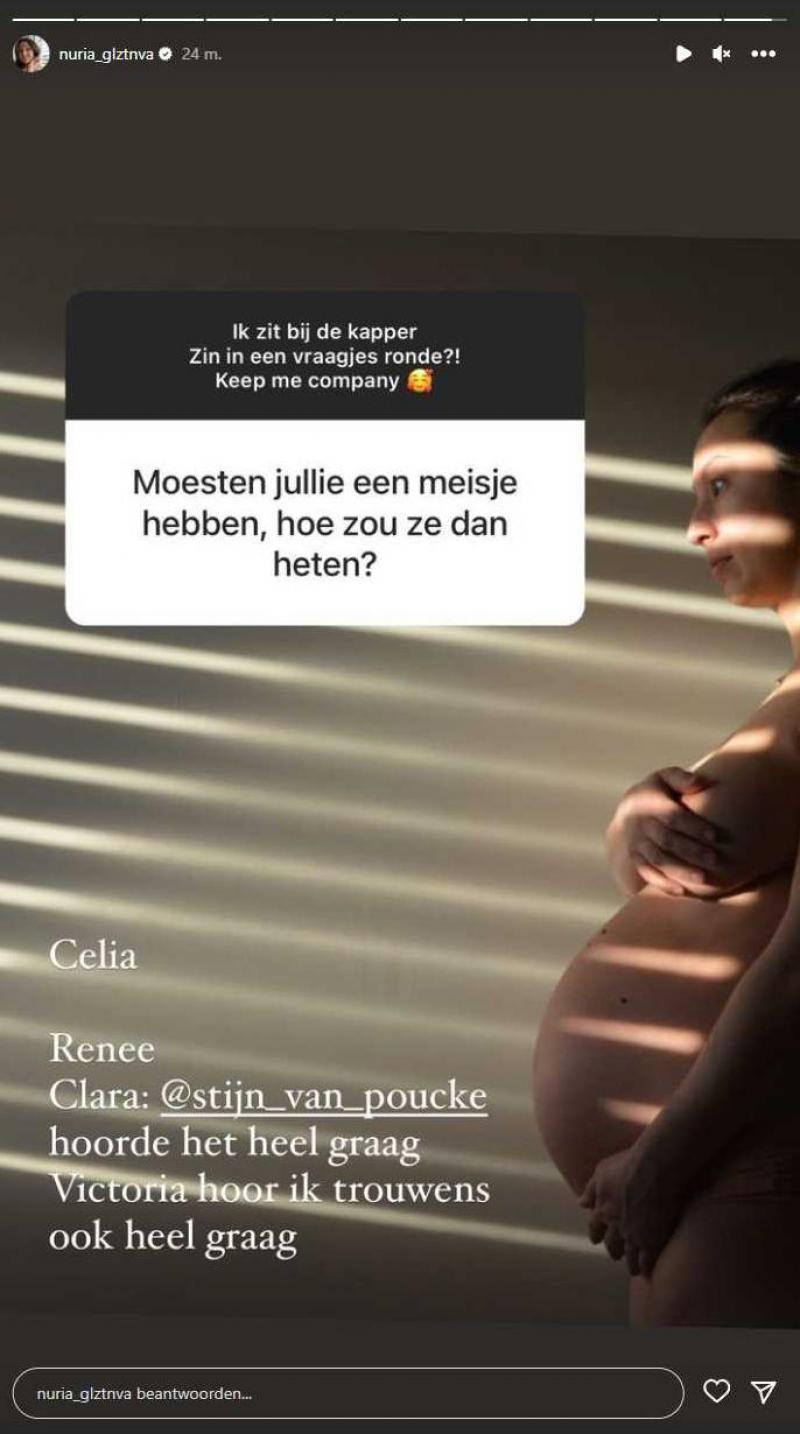 Tijdens een vragenuurtje op Instagram vroeg iemand haar het volgende: «Mochten jullie een meisje hebben, hoe zou ze dan heten?». Nuria gaf enkele opties: «Celia of Renee. Victoria hoor ik ook heel graag», schrijft ze. En Stijn zou een voorkeur hebben voor Clara.