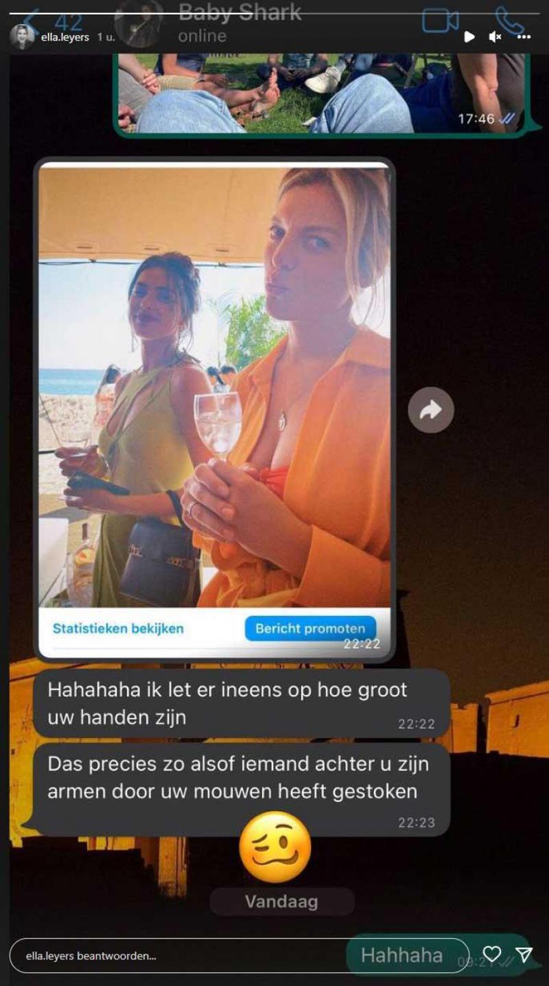 De 24-jarige brunette ontdekte immers iets grappigs op de foto. «Hahaha, ik let er ineens op hoe groot uw handen zijn. Da’s precies zo alsof iemand achter u zijn armen door uw mouwen heeft gestoken», stuurde ze naar haar 33-jarige zus. Ella liet vervolgens met een gekwetste emoticon weten wat ze daarvan vond...