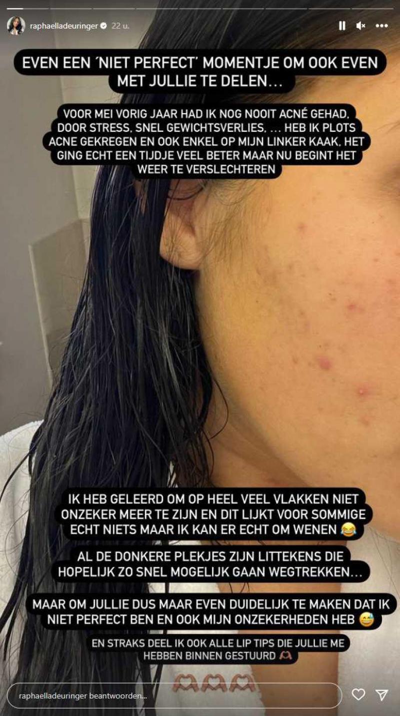 De 23-jarige brunette uit Waterloo mag er op haar foto’s haast perfect uitzien, maar ook zij heeft haar ‘onvolmaaktheden’. Zo kampt ze de laatste tijd met hardnekkige acne en deelde ze er een foto van. «Even een ‘niet perfect’ momentje om ook even met jullie te delen. Voor mei vorig jaar had ik nog nooit acne gehad. Door stress, snel gewichtsverlies, ... heb ik plots acne gekregen en ook enkel op mijn linkerkaak. Het ging echt een tijdje veel beter, maar nu begint het weer te verslechteren», schrijft ze erbij.
