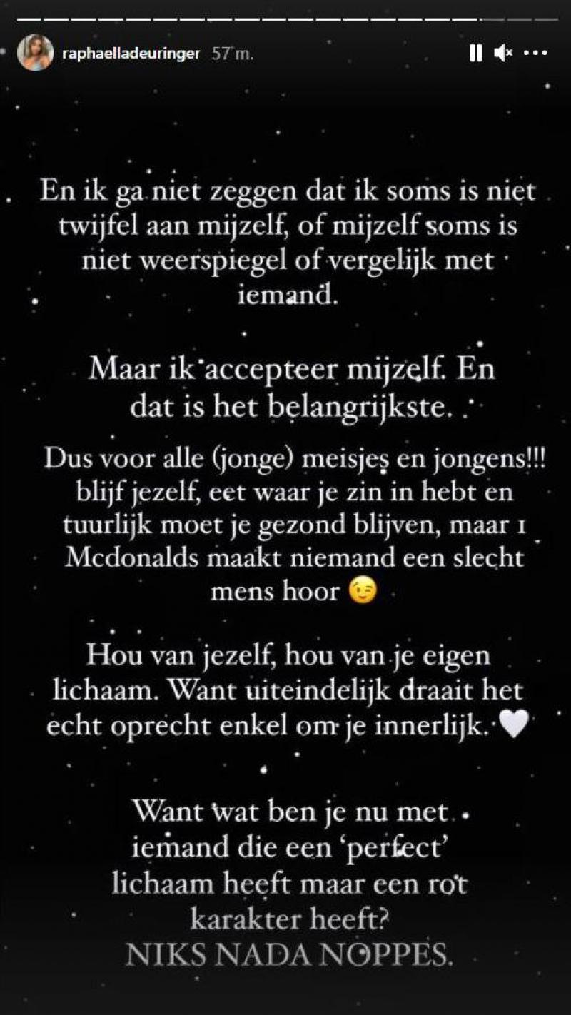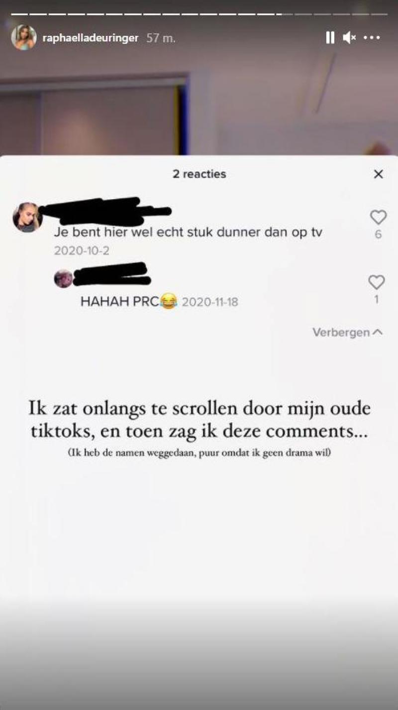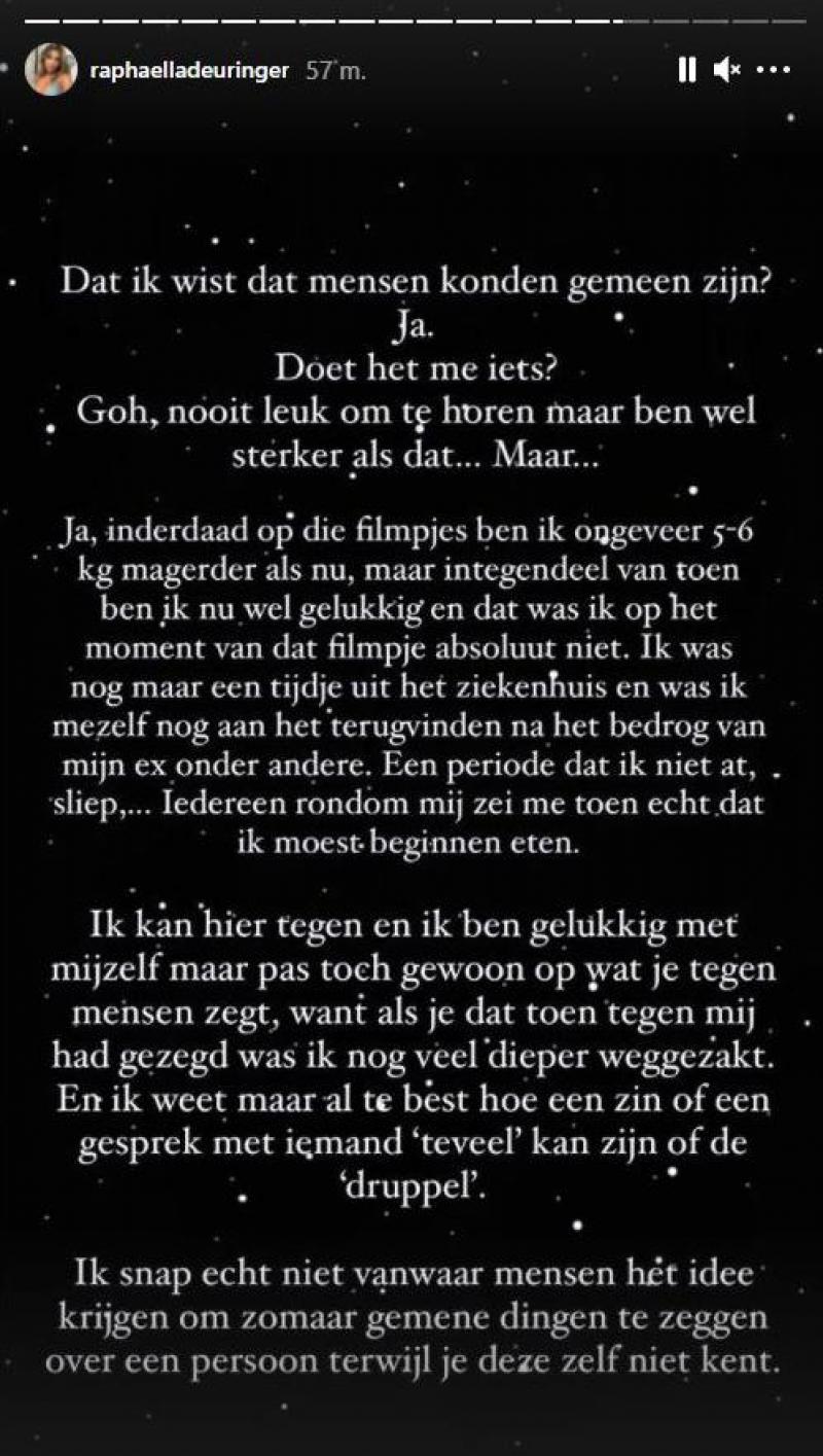 De 22-jarige brunette uit Waterloo zag dat een TikTok-volger een reactie had geplaatst onder een filmpje van mei 2020. “Je bent hier wel echt een stuk dunner dan op tv”, schreef de volger. Raphaëlla liet de kritiek niet zomaar passeren en schreef een oprecht antwoord op Instagram. “Ik zat onlangs te scrollen door mijn oude TikToks, en toen zag ik deze comment. Dat ik wist dat mensen gemeen konden zijn? Ja. Doet me het iets? Goh, nooit leuk om te horen, maar ben wel sterker dan dat. Maar… Ja, inderdaad: op die filmpjes ben ik ongeveer 5 à 6 kg magerder dan nu, maar in tegenstelling tot toen ben ik nu wel gelukkig en dat was ik op het moment van dat filmpje absoluut niet. Ik was nog maar een tijdje uit het ziekenhuis en ik was mezelf nog aan het terugvinden na het bedrog van mijn ex onder andere. Dat was een periode waarin ik niet at, sliep, … Iedereen rondom mij zei me toen echt dat ik moest beginnen eten”, klinkt het.