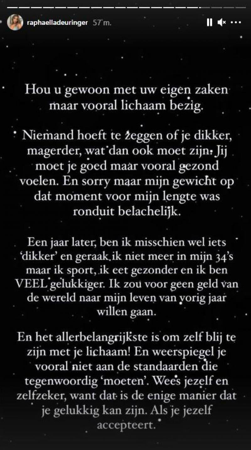 “Hou je gewoon met je eigen zaken, maar vooral lichaam, bezig. Niemand hoeft te zeggen of je dikker, magerder, of wat dan ook moet zijn. Jij moet je goed, maar vooral gezond voelen. En sorry, maar mijn gewicht op dat moment voor mijn lengte was ronduit belachelijk. Een jaar later ben ik misschien wel iets ‘dikker’ en geraak ik niet meer in mijn 34’s, maar ik sport, ik eet gezonder en ik ben VEEL gelukkiger. Ik zou voor geen geld van de wereld naar mijn leven van vorig jaar willen gaan”, luidt het.