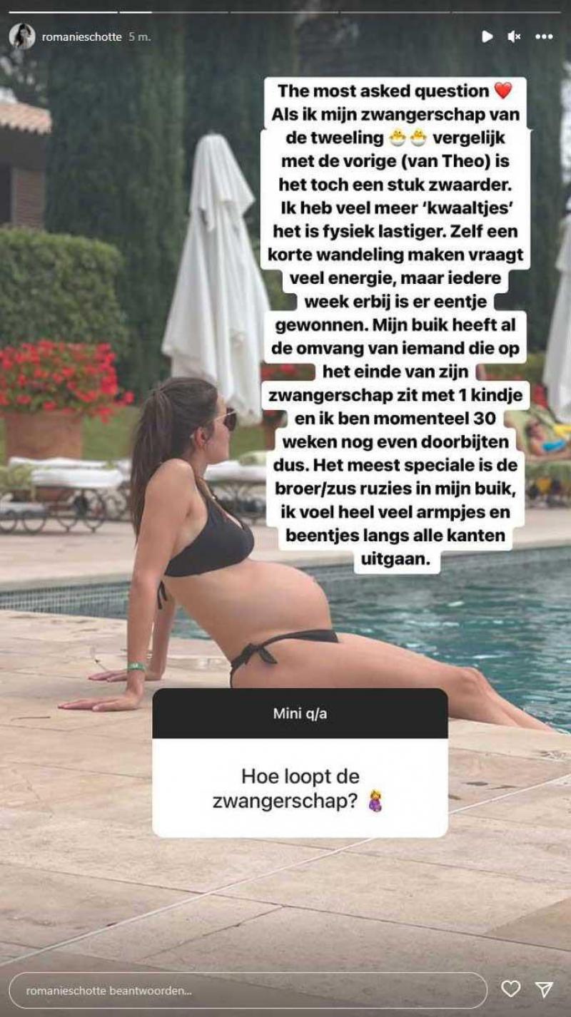 Het mag dan ook niet helemaal verbazen dat deze zwangerschap minder vlot gaat. «Als ik mijn zwangerschap van de tweeling vergelijk met de vorig (van Theo) is het toch een stuk zwaarder. Ik heb veel meer ‘kwaaltjes’ en het is fysiek lastiger. Zelfs een korte wandeling maken vraagt veel energie, maar iedere week erbij is er eentje gewonnen. Mijn buik heeft al de omvang van iemand die op het einde van haar zwangerschap zit met één kindje en ik ben momenteel 30 weken, dus nog even doorbijten. Het meest speciale is de broer/zus ruzies in mijn buik. Ik voel heel veel armpjes en beentjes langs alle kanten uitgaan», schrijft ze op Instagram naast een foto waarop haar buik te zien is.