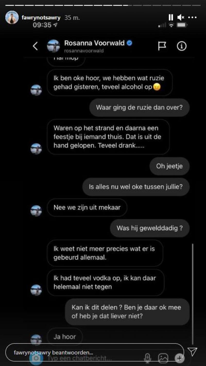 Reality-insider Fawry Not Sawry vroeg Rosanna wat er gebeurd was. Blijkbaar liep het uit de hand op een feestje van vrienden. Gevraagd of Niels gewelddadig was, reageert ze het volgende: «Ik weet niet meer precies wat er allemaal gebeurd is. Ik had te veel vodka op en kan daar helemaal niet tegen», klinkt het. Ze bevestigde wel nogmaals dat hun relatie over & out is.