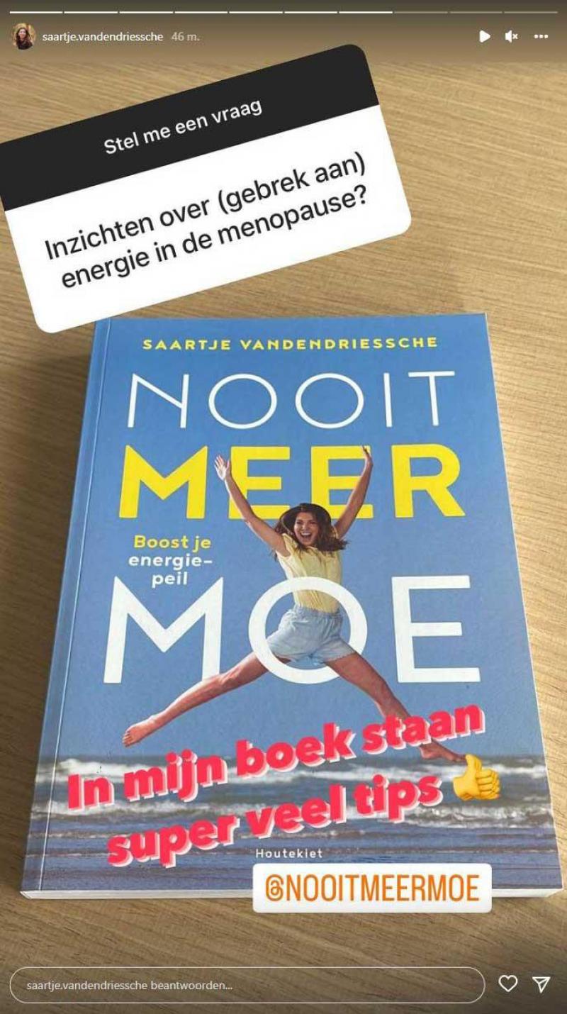Daarnaast liet ze weten dat ze momenteel «very happy» is. Enkele maanden geleden kwam haar tweede boek uit: ‘Nooit Meer Moe’. Daarin geeft ze uit eigen ervaring tips om minder moe te zijn.