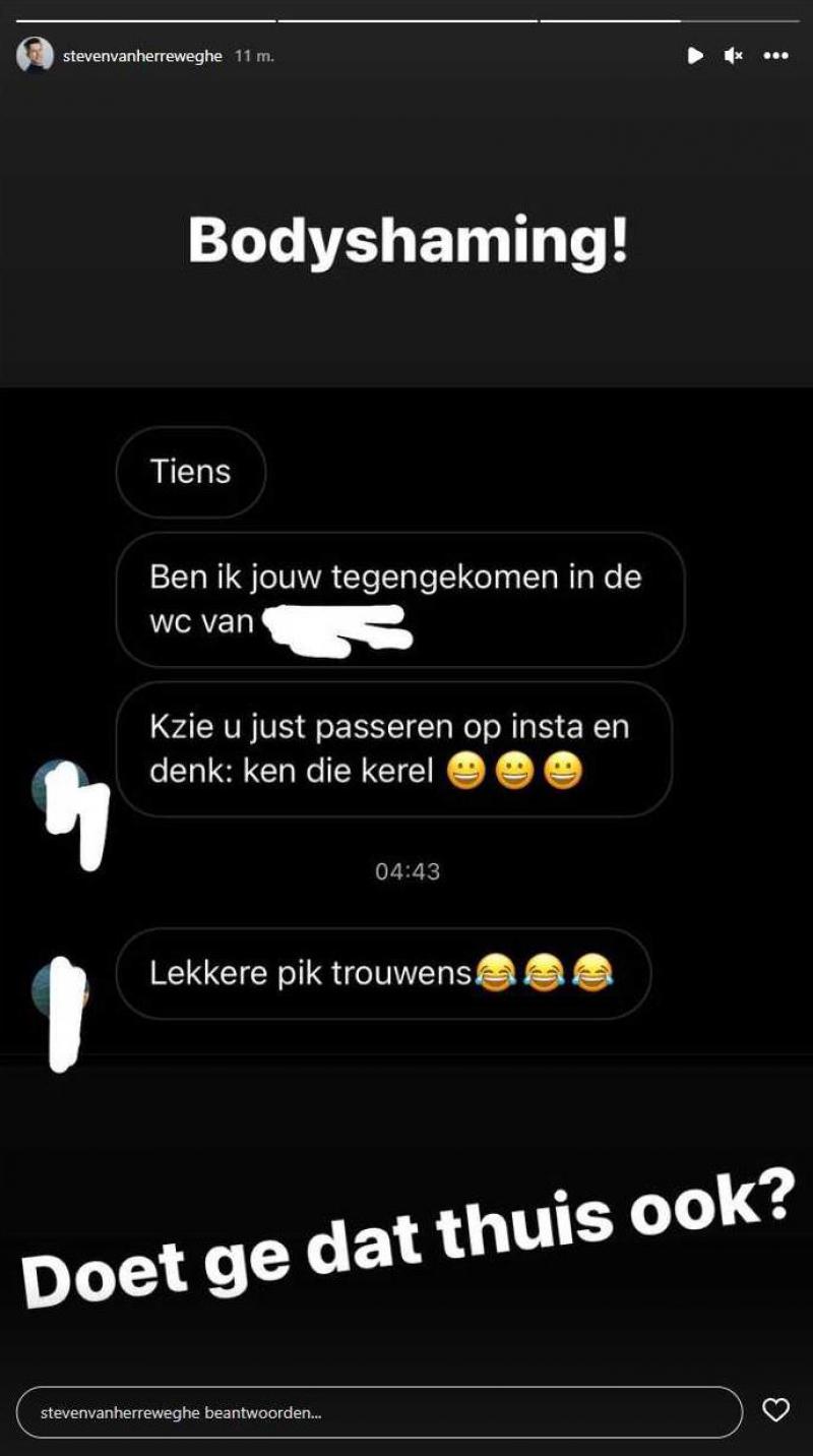 Van Herreweghe deelde een screenshot van het ‘gesprek’ op Instagram. «Bodyshaming! Doet ge dat thuis ook?», schreef hij er met een knipoog bij.