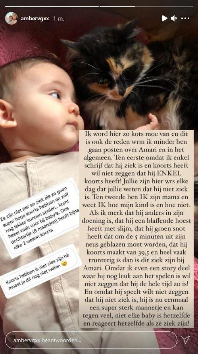 Dat commentaar schoot bij Amber in het verkeerde keelgat. «Ik word hier zo kotsmoe van en dit is ook de reden waarom ik minder post over Amari en in het algemeen. Ten eerste is het niet omdat ik enkel schrijf dat hij ziek is en koorts heeft, dat hij ENKEL koorts heeft! Jullie zijn hier waarschijnlijk elke dag dat jullie weten dat hij niet ziek is», schrijft ze op Instagram.