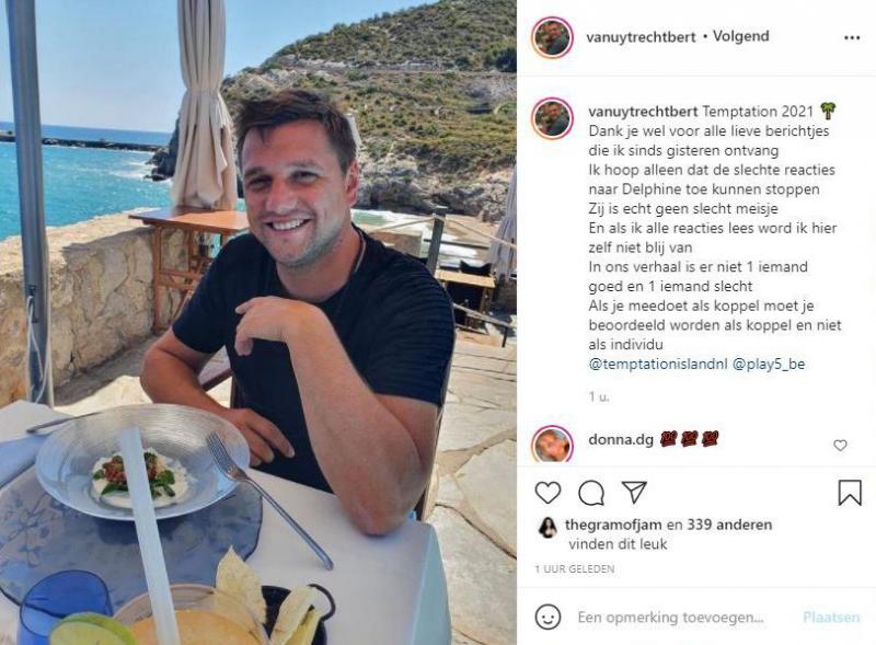 Bert heeft nu genoeg van die commentaren op Delphine en trok naar Instagram om dat duidelijk te maken. «Dank je wel voor alle lieve berichtjes die ik sinds gisteren ontvang. Ik hoop alleen dat de slechte reacties naar Delphine toe kunnen stoppen. Zij is echt geen slecht meisje. En als ik alle reacties lees word ik hier zelf niet blij van. In ons verhaal is er niet één iemand goed en één iemand slecht. Als je meedoet als koppel moet je beoordeeld worden als koppel en niet als individu», schrijft hij.