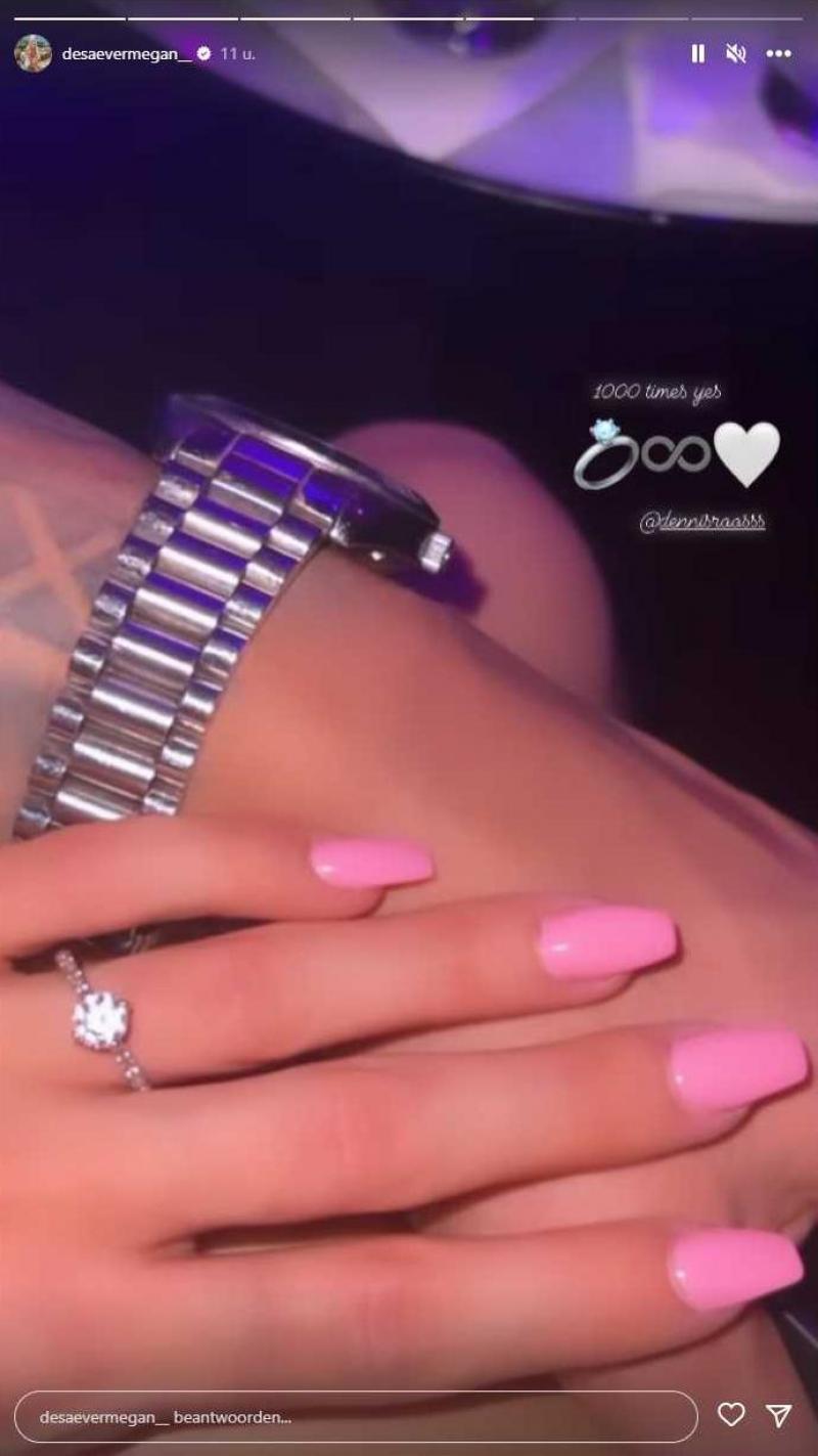 Nu blijkt dat Megan plots verloofd is. Vijf weken geleden leerde ze Dennis Roos kennen. Volgens enkele Nederlandse juicechannels liepen ze elkaar tegen het lijf tijdens de opnames van een nieuw seizoen van ‘Ex On The Beach: Double Dutch’. Afgelopen weekend vroeg Dennis haar ten huwelijk en kreeg hij een meer dan positief antwoord. «1000 keer ja!», schrijft Megan op Instagram bij een foto van haar verlovingsring.