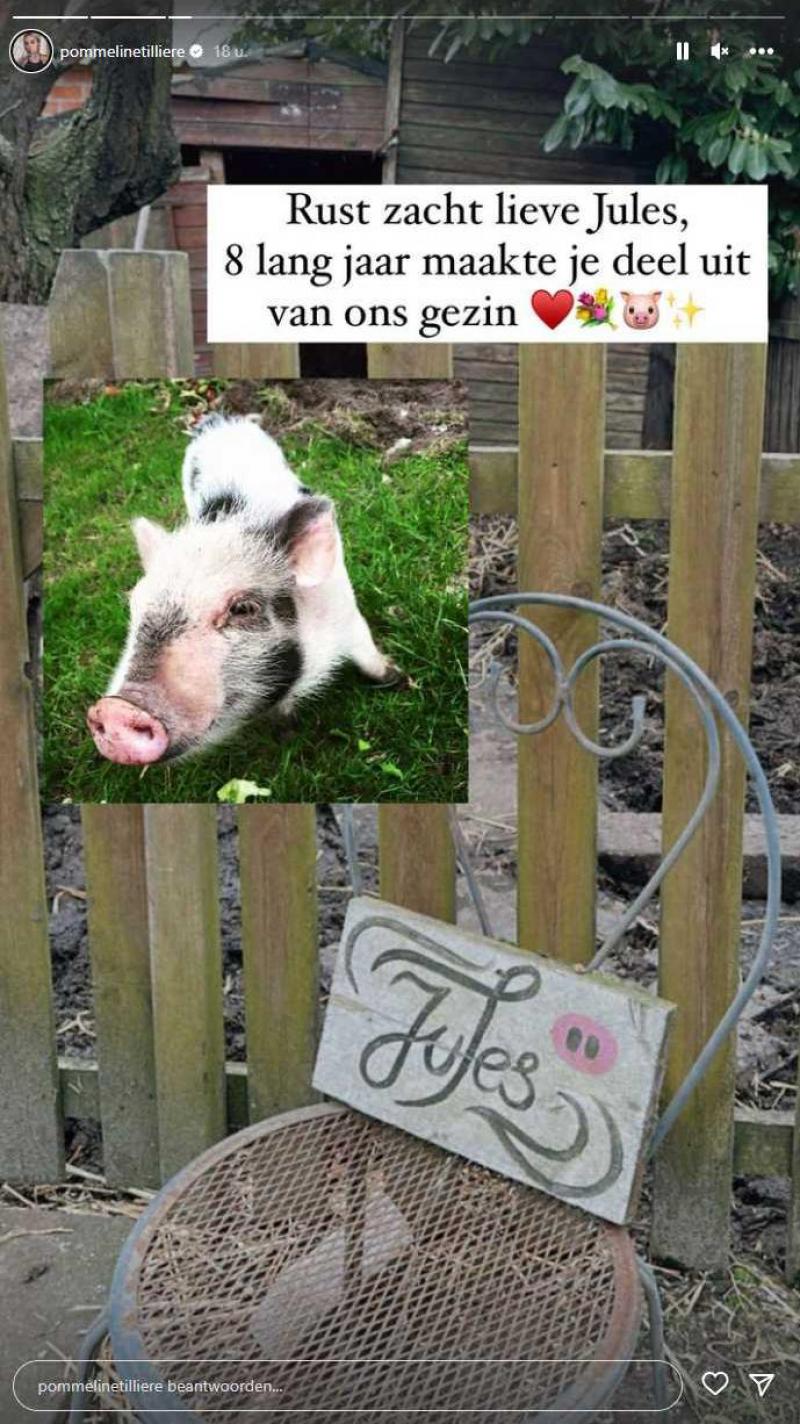 Droevig nieuws ten huize Pommeline Tillière. Haar varkentje Jules is overleden. De 28-jarige tattoo-artieste deelde een foto van de schattige viervoeter op Instagram. «Rust zacht, lieve Jules. Acht jaar lang maakte je deel uit van ons gezin», klinkt het.