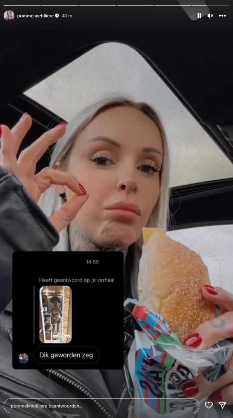 Gisteren maakte de knappe blondine een gelijkaardige situatie mee. Ze hield een fotoshoot en deelde een lingerieselfie van achter de schermen. Een volger voelde zich geroepen om «dik geworden zeg» te reageren op de foto. Pommeline liet de kritiek niet aan haar hart komen en antwoordde met een video waarin ze een broodje smos eet. «Heerlijk», geniet ze er zichtbaar van.