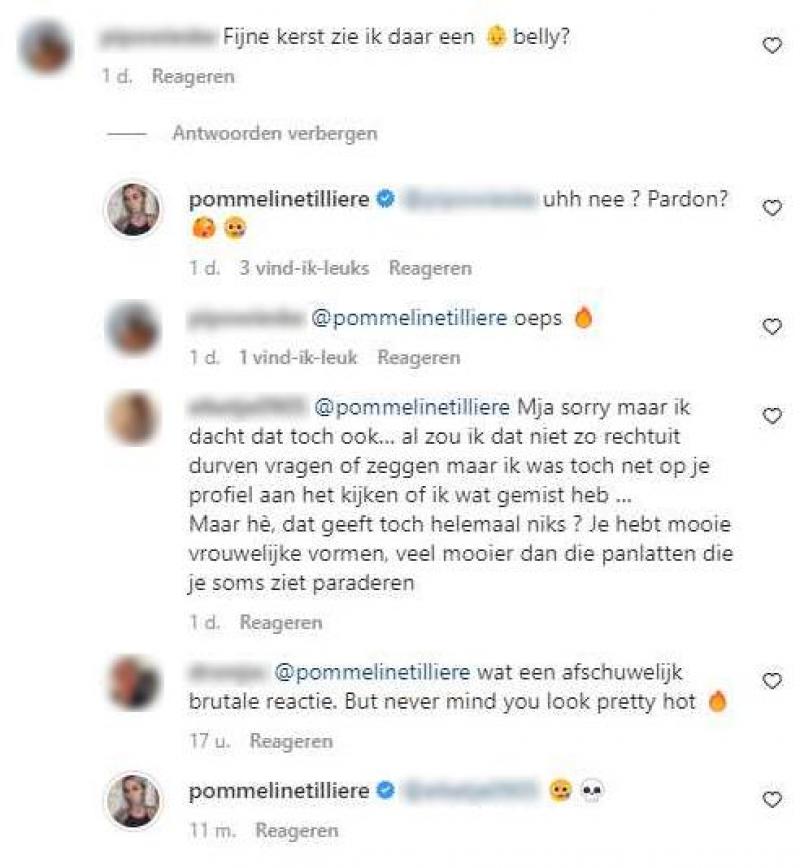Enkele volgers stelden zich immers openlijk een nogal gevoelige vraag. «Zie ik daar een babybuikje?!», klonk het. «Euh, nee? Pardon?», antwoordde Pommeline. Een andere volger mengde zich in de discussie. «Mja sorry maar ik dacht dat toch ook, al zou ik dat niet zo rechtuit durven vragen of zeggen, maar ik was toch net op je profiel aan het kijken of ik wat gemist heb... Maar hé, dat geeft toch helemaal niks? Je hebt mooie vrouwelijke vormen, veel mooier dan die panlatten die je soms ziet paraderen», luidde het.