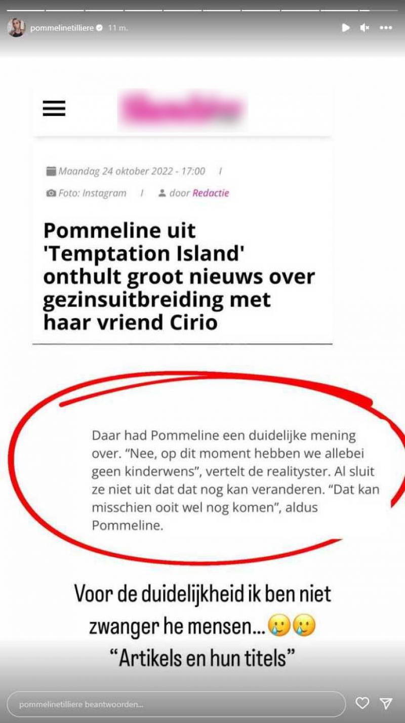 Een website bracht dat nieuws onder een iets te ‘enthousiaste’ titel, dus nam Pommeline op Instagram alle twijfel meteen weg. «Voor de duidelijkheid: ik ben niet zwanger, hé mensen. ‘Artikels en hun titels’», klonk het.