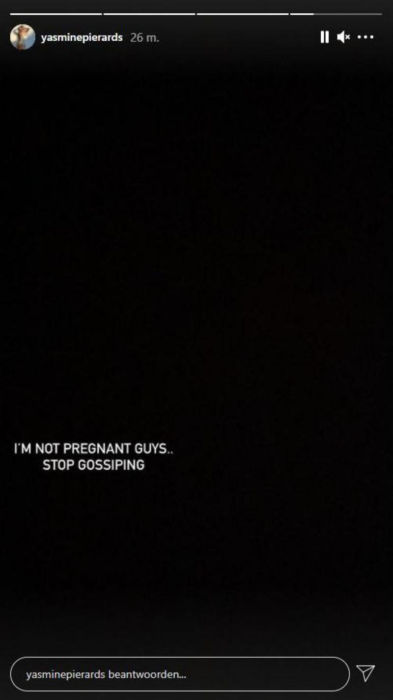 Yasmine bracht dan maar zelf duidelijkheid. «Ik ben niet zwanger, mensen. Stop met roddelen!», schrijft ze.