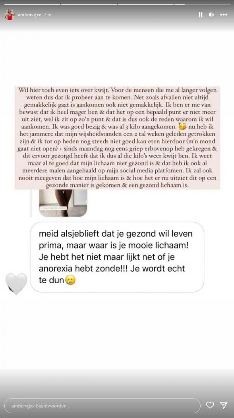 Amber deelde de bewuste opmerking op Instagram en verweerde zich uitvoerig. Ze legt uit dat ze beseft dat ze mager is, maar dat ze door omstandigheden niet bijkomt. «De mensen die me al langer volgen, weten dat ik probeer aan te komen. Net zoals afvallen niet altijd gemakkelijk gaat, is aankomen ook niet gemakkelijk. Ik ben me ervan bewust dat ik heel mager ben en dat het er op een bepaald punt niet meer uitziet. Wel, ik zit op zo’n punt en dat is de reden waarom ik wil aankomen», schrijft ze.