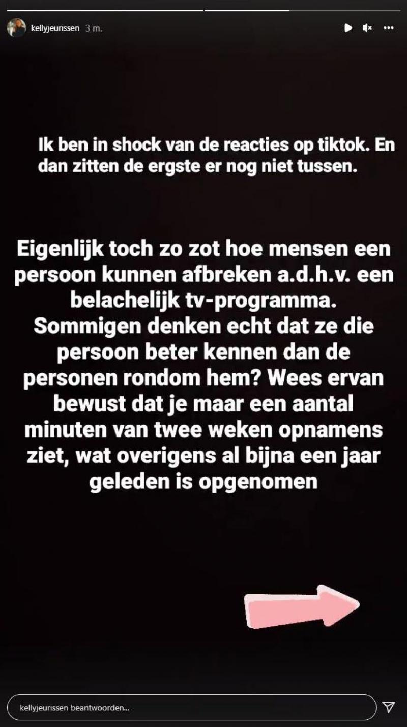 Kelly is dat meer dan beu en schrijft de frustratie van zich af op Instagram. «Ik ben in shock van de reacties op TikTok. En dan zitten de ergste er nog niet tussen. Eigenlijk toch zo zot hoe mensen een persoon kunnen afbreken aan de hand van een belachelijk tv-programma. Sommigen denken echt dat ze die persoon beter kennen dan de personen rondom hem... Wees ervan bewust dat je maar een aantal minuten van twee weken opnames ziet, wat overigens al bijna een jaar geleden is opgenomen».