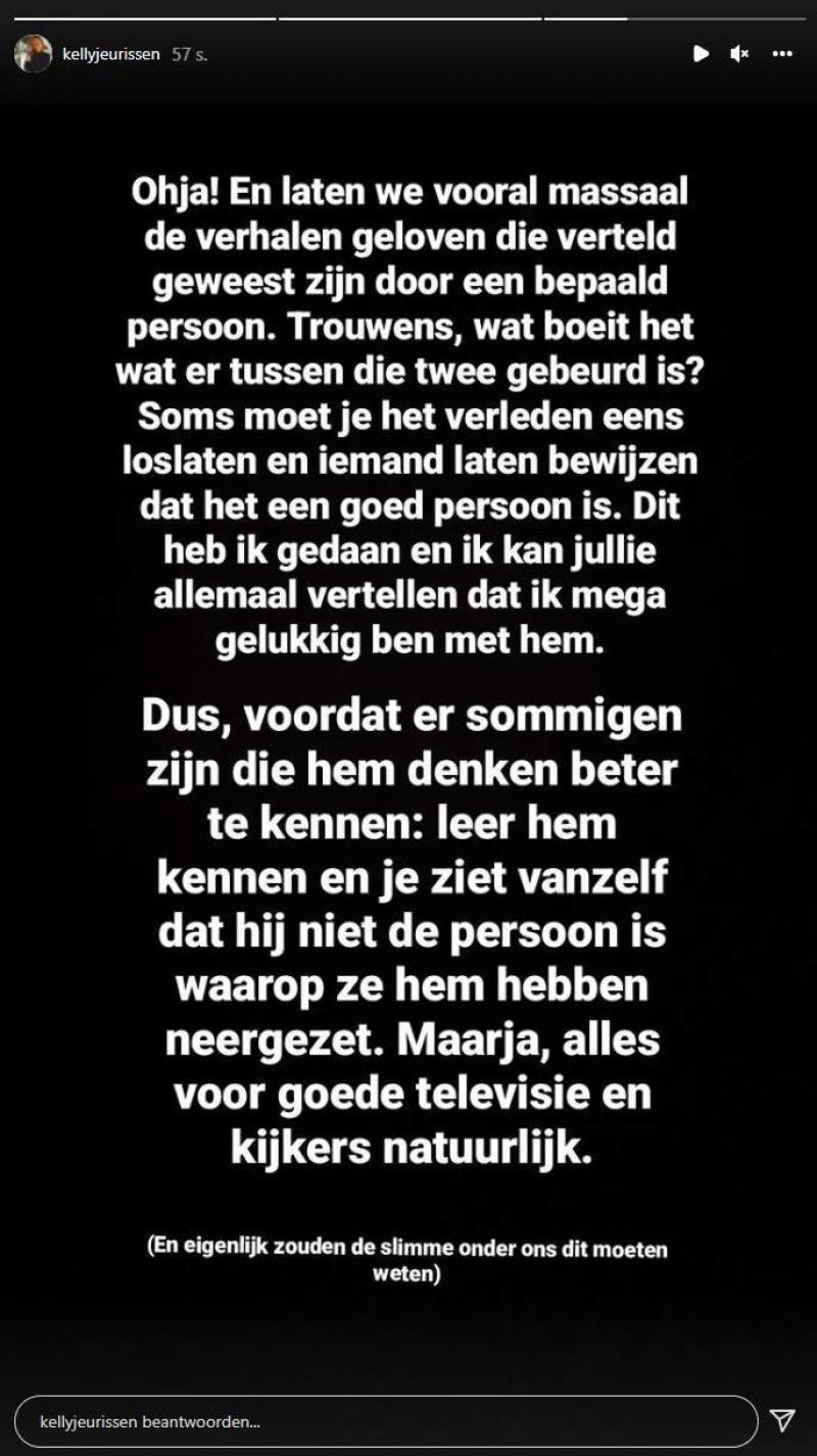 «En laten we vooral massaal de verhalen geloven die verteld werden door een bepaald persoon. Wat boeit het wat er tussen die twee gebeurd is? Soms moet je het verleden eens loslaten en iemand laten bewijzen dat hij een goed persoon is. Dit heb ik gedaan en ik kan jullie allemaal vertellen dat ik mega gelukkig ben met hem. Dus voordat er sommigen zijn die hem denken beter te kennen: leer hem kennen en je ziet vanzelf dat hij niet de persoon is waarop ze hem hebben neergezet. Maar ja, alles voor goede televisie en kijkers natuurlijk», zucht ze.