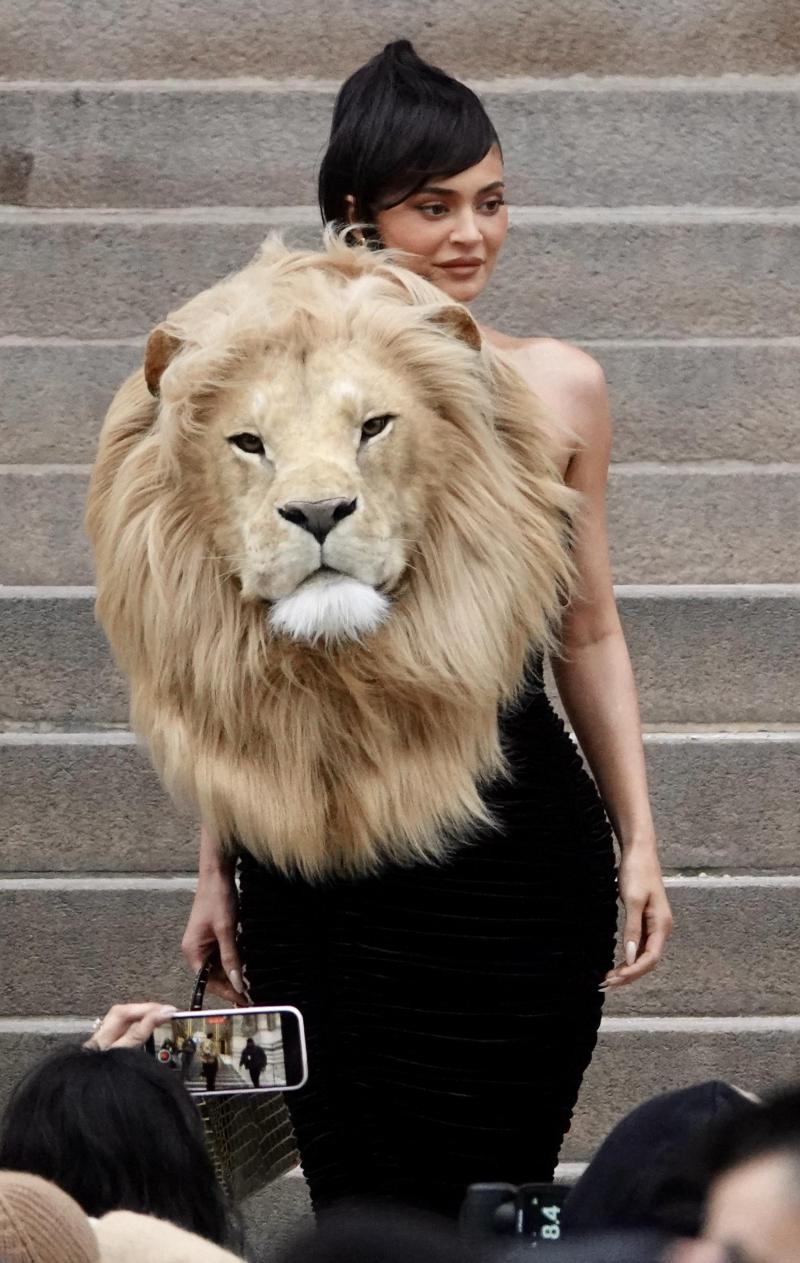 Je kunt er niet omheen: de leeuwenkop op Jenners jurk ziet er levensecht uit. Mocht je niet beter weten, zou je verwachten dat haar broche ieder moment kan beginnen te brullen. Toch kwam er geen enkel stukje leeuw aan de outfit te pas: het hoofd werd volledig gemaakt met schuim en andere kunstmatige materialen. Schiaparelli, die de jurk ontwierp, spreekt van ‘faux-taxidermie’, ofwel valse opgezette dieren.