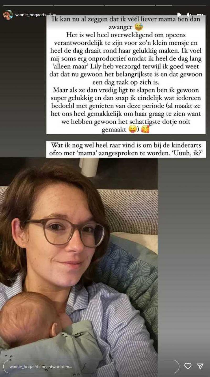 Op 22 september werden Winnie Bogaerts (31) en Jonah Hulselmans (33) voor het eerst mama en papa van een meisje, Lily. Intussen zijn we al enkele weken verder en heeft Winnie kennisgemaakt met het moederschap. «Ik kan nu al zeggen dat ik véél liever mama ben dan zwanger. Het is wel heel overweldigend om opeens verantwoordelijk te zijn voor zo’n klein mensje en heel de dag draait rond haar gelukkig maken. Ik voel mij soms erg onproductief omdat ik heel de dag lang ‘alleen maar’ Lily heb verzorgd terwijl ik goed weet dat dat nu gewoon het belangrijkste is en dat gewoon een dagtaak op zich is», schrijft ze op Instagram.