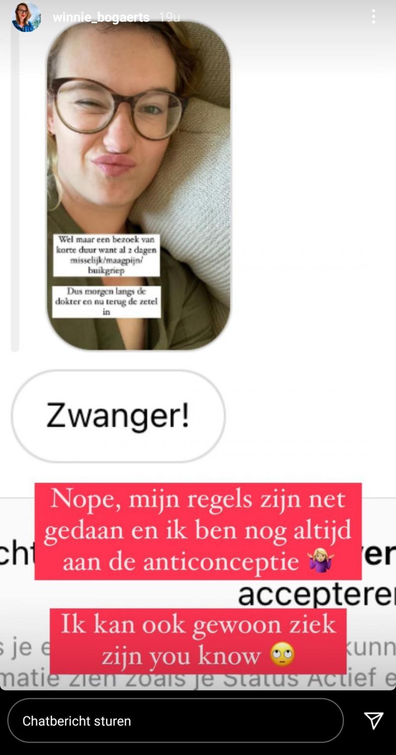 Onlangs liet Winnie op Instagram weten dat ze al enkele dagen last had van misselijkheid en dat ze naar de dokter zou gaan om het te laten nakijken. Een volger antwoordde daarop dat ze misschien zwanger is. Dat is echter niet het geval, zo blijkt. «Nope, mijn regels zijn net gedaan en ik ben nog altijd aan de anticonceptie. Ik kan ook gewoon ziek zijn, weet je», reageerde ze.