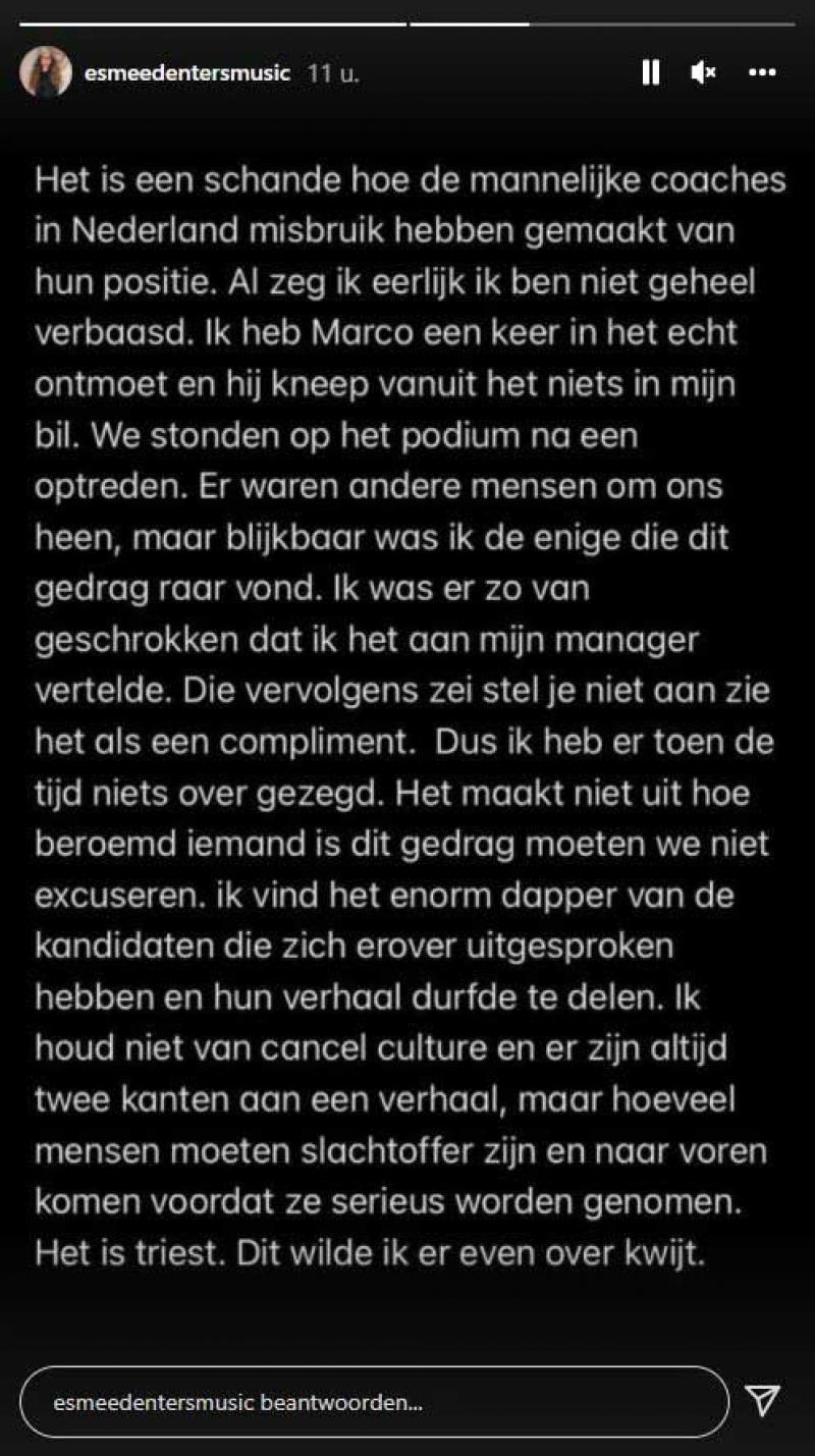 Esmée Denters is een 33-jarige zangeres die in 2015 meedeed aan ‘The Voice UK’, maar niet aan ‘The Voice of Holland’. Ze vertelt dat de aantijgingen niet geheel onverwacht komen omdat ze zelf een nare ervaring had met Marco Borsato na een optreden. «Het is een schande hoe de mannelijke coaches in Nederland misbruik hebben gemaakt van hun positie. Al ben ik niet geheel verbaasd. Ik heb Marco een keer in het echt ontmoet en hij kneep vanuit het niets in mijn bil. We stonden op het podium na een optreden. Er waren andere mensen om ons heen, maar blijkbaar was ik de enige die dit gedrag raar vond», schrijft ze.