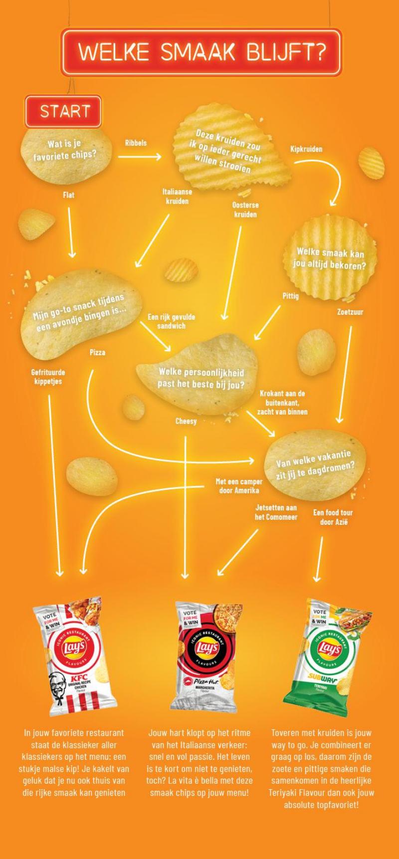 De smaken zijn jammer genoeg ‘limited edition’ en zullen dus binnenkort uit de rekken verdwijnen. Maar niet getreurd, één van de ‘Restaurant flavours’ mag wel blijven en zal zelfs een vast waarde in het Lay’s-assortiment worden. En welke chipssmaak mag blijven, dat bepaal jij zelf. Nog tot eind november kan je op jouw favoriet stemmen via www.lays.be/irf. Ben je er nog niet helemaal uit welke van de drie smaken het beste bij je past? Dan helpt de test hieronder je misschien op weg.