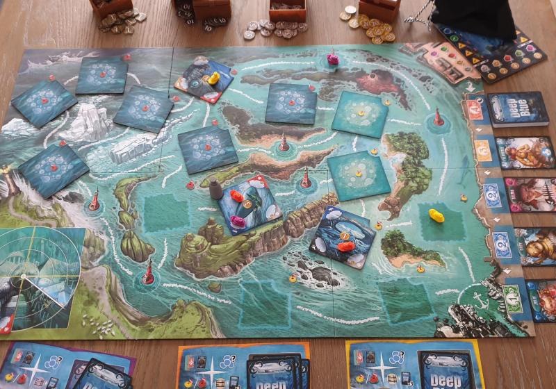 In Deep Blue nemen 2 tot 5 doorwinterde kapiteins het tegen elkaar op om de zeebodem af te schuimen op zoek naar ongeziene rijkdommen. De doos is zelf al een aanzienlijke schat met 15 wraktegels, een spelbord, 10 schepen, 50 bemannings- & 7 scenariokaarten, 6 startfiches, 31 gekleurde acryl edelstenen, een stoffen zak, een resem overwinningspunten in plastieken schatkisten, spelersborden en een duikplaatsbord.
