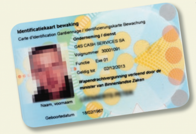 Identificatiekaart bewakingsagent - Elke bewakingsagent draagt verplicht een identificatiekaart bij zich. Deze bewijst dat de bewakingsagent zijn bewakingsfunctie wettelijk mag uitoefenen.