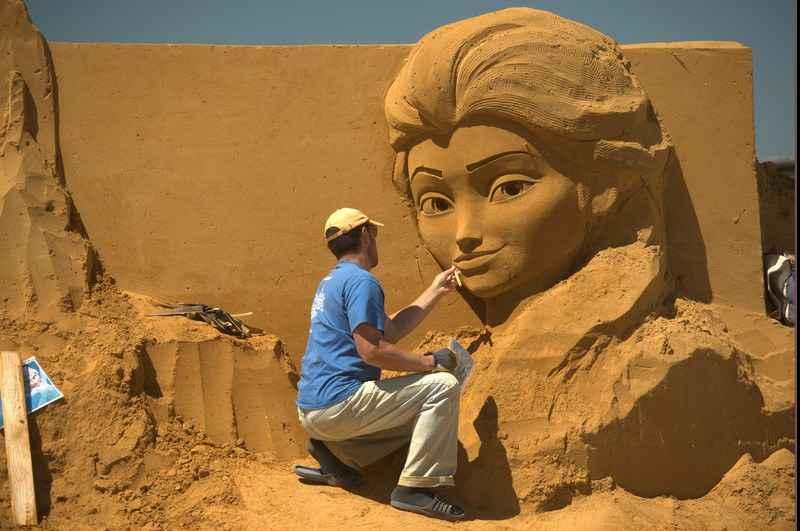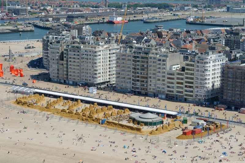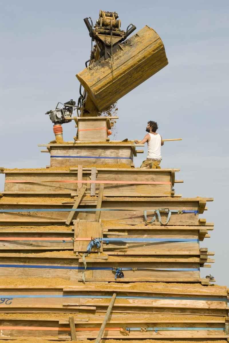 Ons werkterrein van 10.000 vierkante meter is maar drie minuten wandelen. Daar starten we elke ochtend met koffie op het strand. Elke artiest werkt aan een van zijn vier beelden, aan een tempo van ongeveer één beeld per zes dagen. Eerst werd het zand uit Waals-Brabant machinaal aangestampt in houten bekistingen, tot keiharde zandblokken.