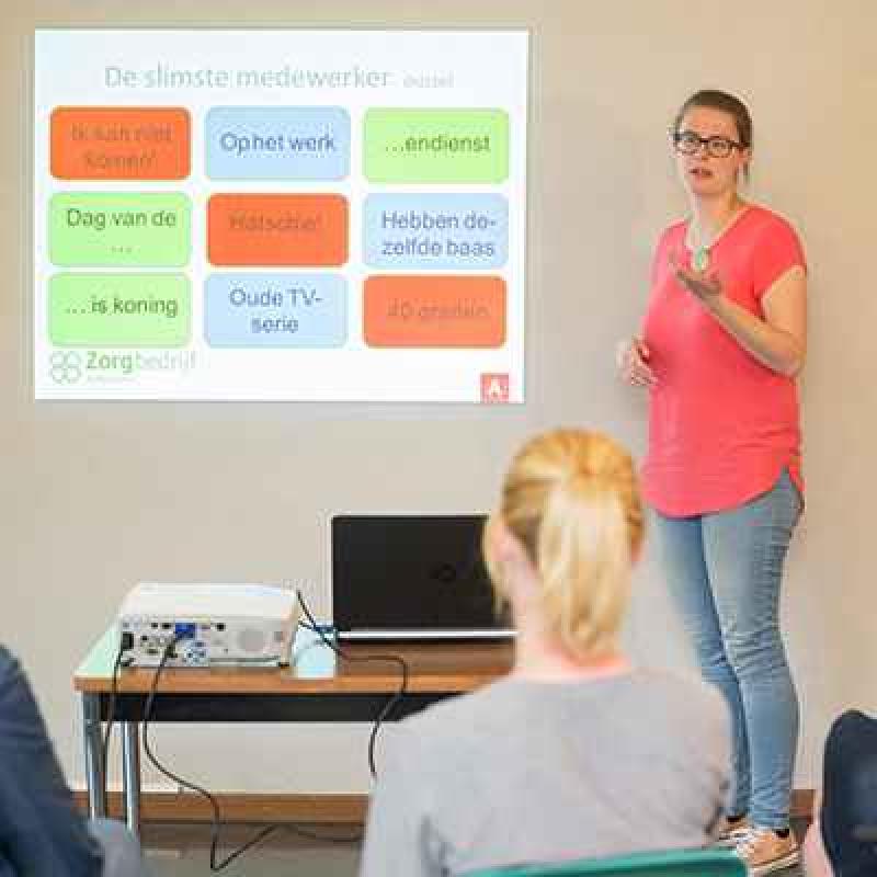 Ik geef regelmatig opleidingen over topics uit mijn vakgebied. Hier zie je me tijdens een vorming over handhygiëne, één van de op te volgen punten in het operationeel plan van kwaliteitszorg.
