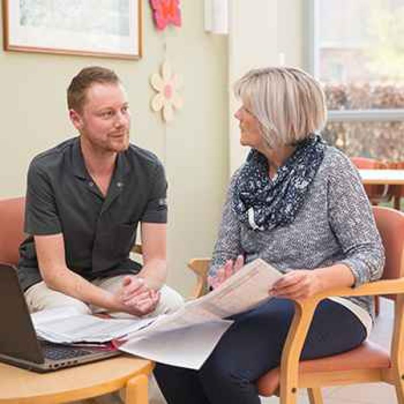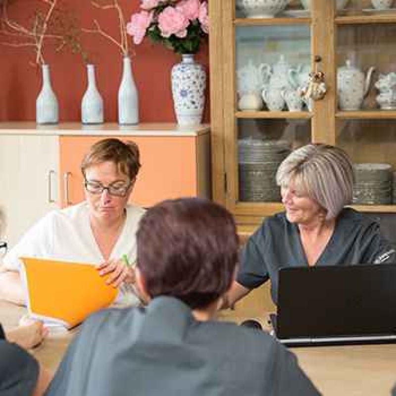 Na de eerste ochtendzorg bij onze bewoners overleg ik met mijn teamleden de gezondheidstoestand van alle bewoners en vragen van de familie. We hebben het over doktersbezoeken en observaties in het woonzorgdossier. Deze meeting is belangrijk want elk teamlid moet goed op de hoogte zijn, om de kwaliteit van de zorg te garanderen. Het coördineren van de zorg en het leiding geven aan mijn team maakt een belangrijk deel uit van mijn takenpakket. Ik ervaar dat als bijzonder prettig.