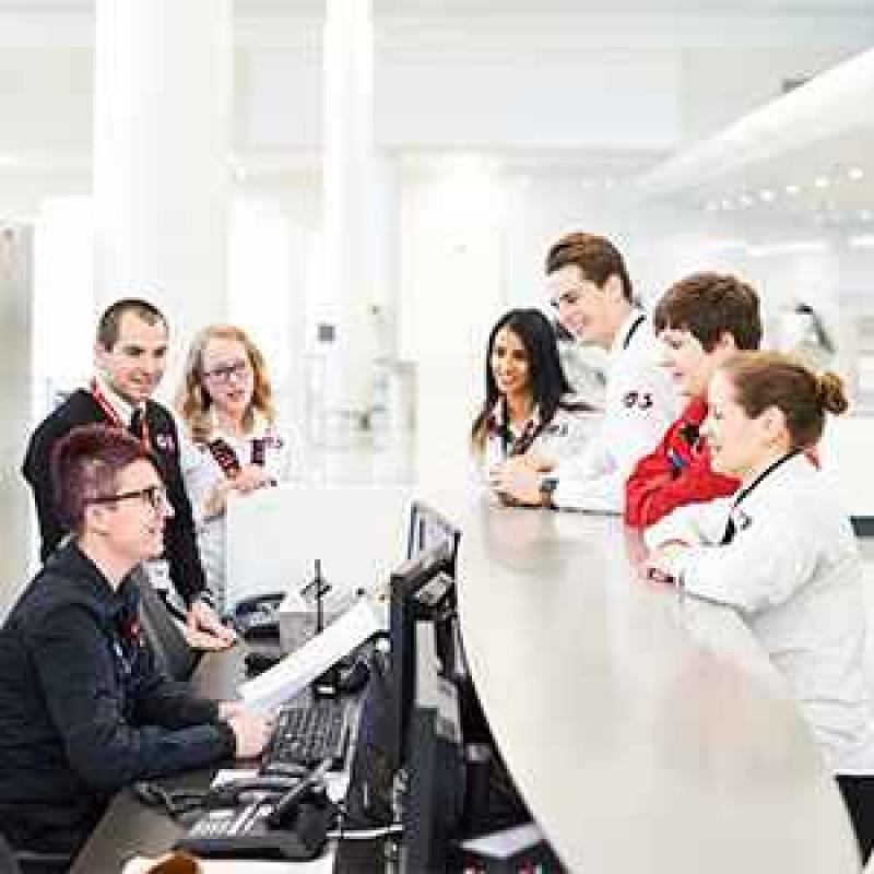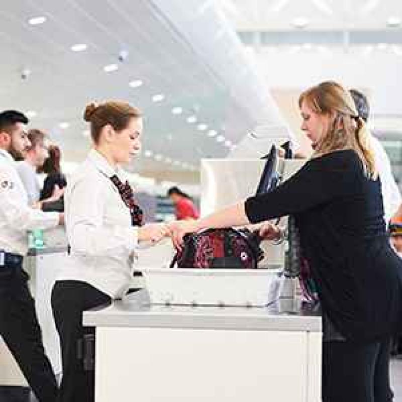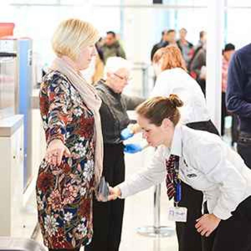 Starten op de positie kruier. Sofie stelt passagiers gerust aan de start van het screeningproces met de juiste instructies. Zo verloopt alles vlot.