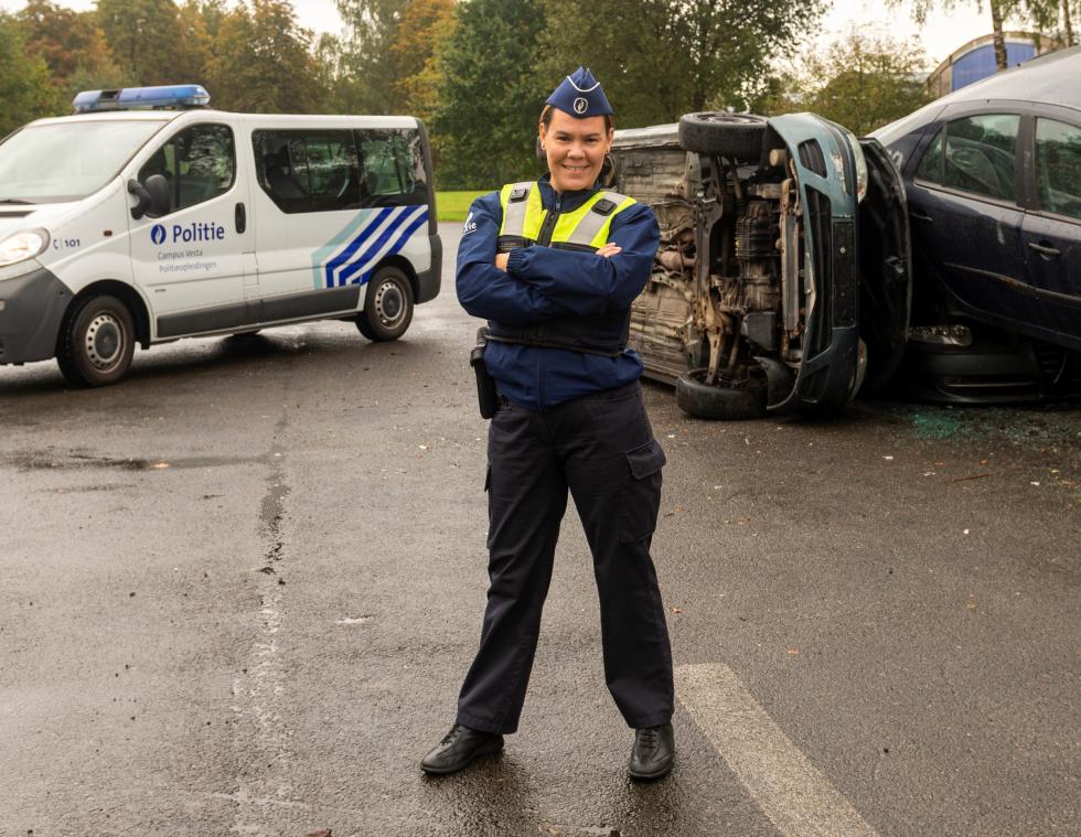 Elke volwassen Belg met een blanco strafblad kan zich inschrijven voor de selectieprocedure. Je legt een cognitieve vaardigheidstest en fysieke proeven af, voert een gesprek met een psycholoog en wordt onderzocht door een arts, weet Vanessa. Ben je bij de gelukkige aspiranten, dan start je het eenjarige opleidingstraject met een introductieweek. Daar maak je kennis met mij of mijn collega Stefan. Vervolgens begin je aan twee maanden theorielessen die je afsluit met een examen. Ben je geslaagd, dan stroom je door naar het tweede blok waar theorielessen worden afgewisseld met praktijk, bijvoorbeeld de vuurwapenopleiding. Zo word je klaargestoomd voor je eerste stage in de diensten wijkwerking, verkeer of onthaal. Dat is absoluut geen kijkstage. Daarna keer je terug naar de schoolbanken en krijg je steeds pittigere rollenspellen voorgeschoteld. Je sluit de opleiding af met een stage bij bijvoorbeeld de dienst noodhulp of de mobiele eenheid en legt je eindexamen af.