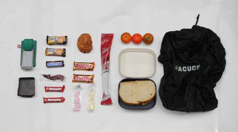 Boterhammen en extra salami - Drie mandarijntjes - Koffiekoek - Veel snoepgoed -Portefeuille - Gsm - Regenhoes voor de rugzak