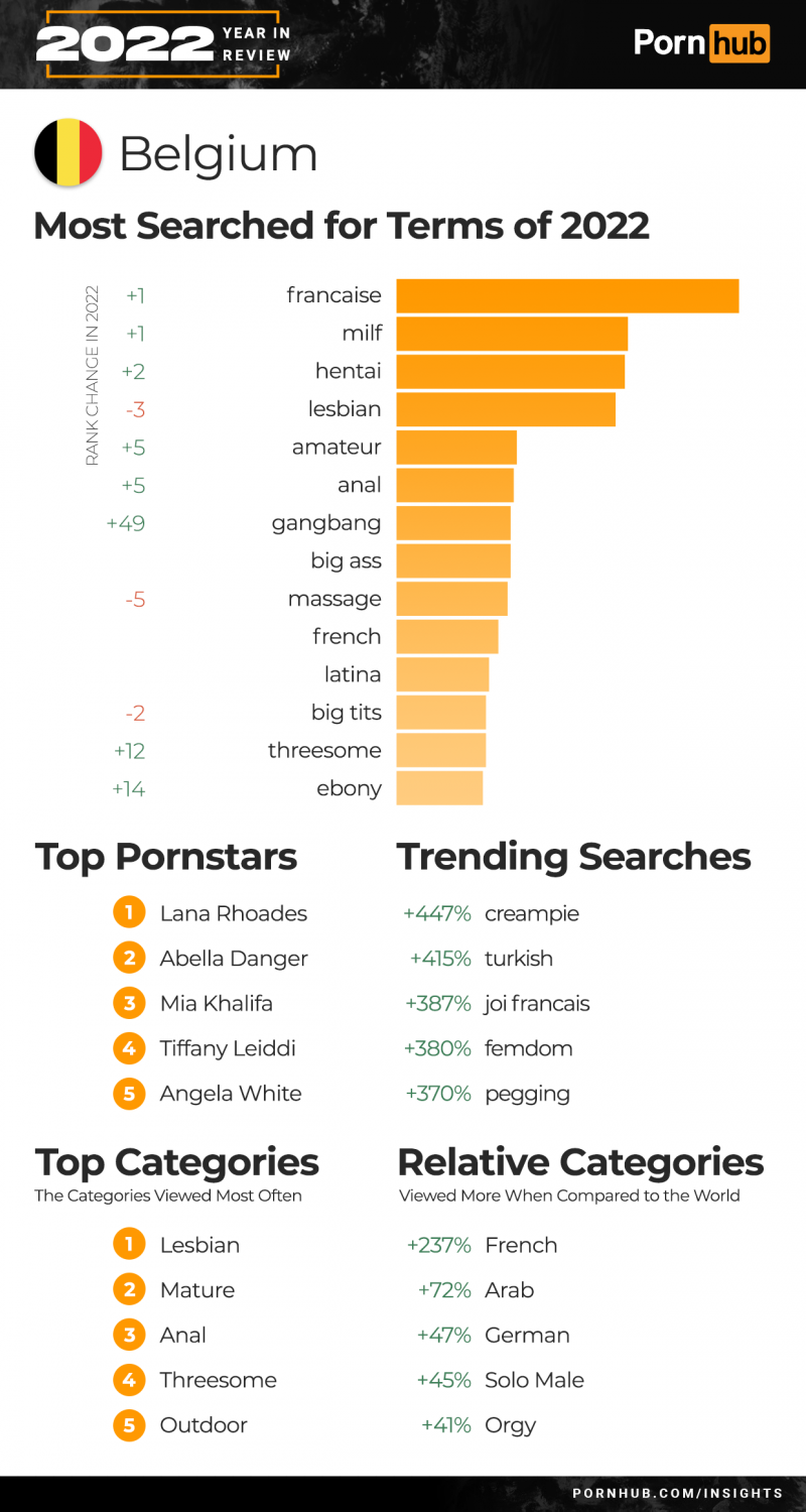 Verder blijkt Lana Rhoades de meest gezochte pornoster in België. Op het wereldtoneel is Abella Danger net iets populairder.