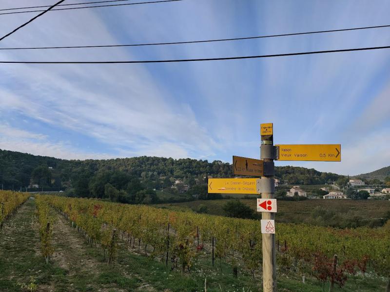 Ook onder onze voeten verandert het uitzicht geregeld. Pierre legt uit dat dit gebied een «sandwich» van verschillende bodems is van onder andere kalksteen, molasse en trias. Een gevolg van miljoenen oude aardplaten en overstromingen. Informatie die enkel relevant is voor National Geographic-fans zou je denken, ware het niet dat net die uiteenlopende sedimenten een grote troef vormen in de Provence: geprezen wijnen. De wijnranken op ons pad groeien voornamelijk grenache en syrah: het soort druivensap waar we al eens graag een extra kilometer meer voor stappen. Zoetekauwen kunnen ook een ommetje maken naar Baumes-de-Venise, het mekka van de Muscat. Paus Clémens de zesde dronk in de veertiende eeuw liters van de sterke zoete witte wijn. Wij geven hem geen ongelijk.