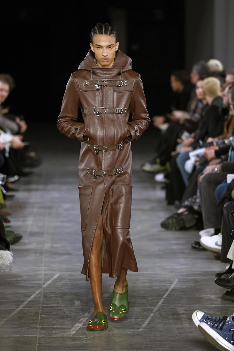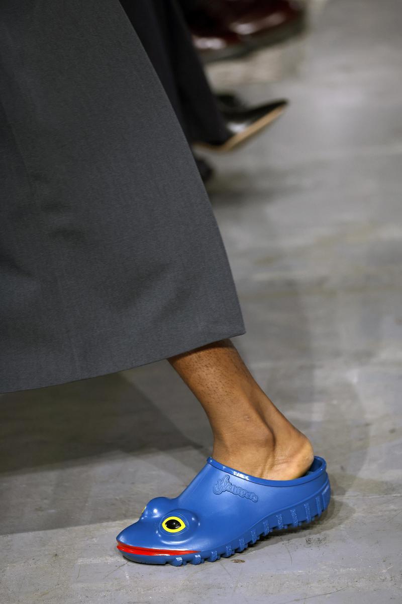 Jonathan Anderson houdt de catwalk graag plezierig en dierlijk. In 2022 lanceerde hij nog de virale duivenclutch, een handtas in de vorm van een duif, en een jurk die leek op een goudvis in een plasticzak. Dit jaar kies JW Anderson, het label van de ontwerper, voor amfibiën.