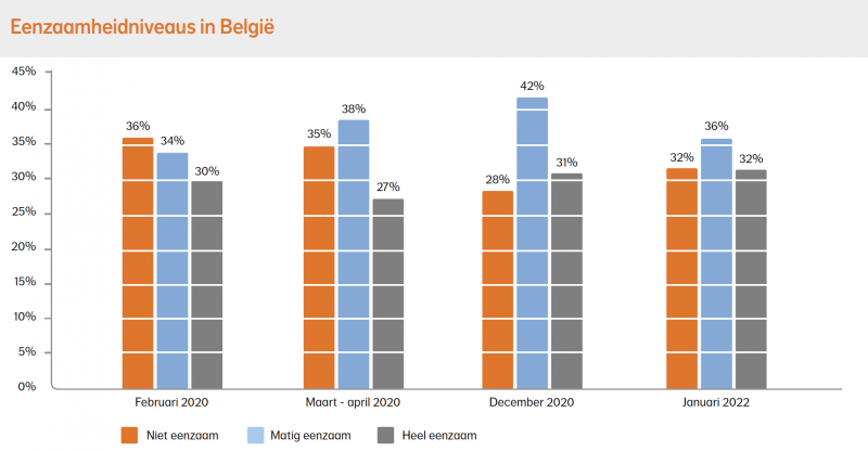 Al sinds 2017 meet het UGent-NN Nationale Geluksonderzoek het niveau van eenzaamheid bij de Belgen. Gedurende de vier meest recente metingen werd de internationaal erkende en wetenschappelijk gevalideerde ‘de Jong – Gierveld’ schaal gehanteerd. De voorbije 2 jaar schommelt het percentage mensen dat erg eenzaam is rond de 30%. Tijdens de coronacrisis was er een verschuiving te zien van mensen die zich niet eenzaam voelden voor de crisis naar meer mensen die zich matig eenzaam voelden. In de meest recente meting van januari 2022 zien we een daling van het aantal matig eenzame mensen maar een verdere toename van het aantal mensen dat erg eenzaam is. Dit bedraagt nu 32%, met andere woorden bijna een derde van de Belgen.