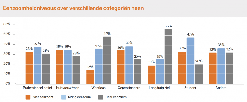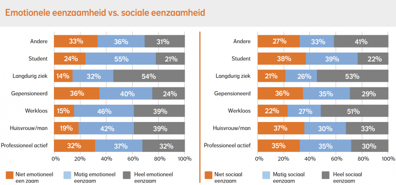 Bij mensen die langdurig ziek zijn ervaren velen een hoge emotionele (54%) en een hoge sociale eenzaamheid (53%). Dit wil zeggen dat meer dan de helft hun sociaal netwerk als zeer beperkt ervaart en dat meer dan de helft geen diepe connectie voelt met de mensen waarmee ze nog contact hebben. Bij mensen die werkloos zijn ligt het iets anders. Daar komt de hoge sociale eenzaamheid ook veel voor (51%), wat betekent dat meer dan de helft een breed sociaal netwerk mist. Hoge emotionele eenzaamheid daarentegen wordt in deze groep iets minder ervaren (39%) in vergelijking met de mensen die langdurig ziek zijn (54%). Opvallend is ook dat relatief veel huisvrouwen en -mannen een hoge emotionele eenzaamheid ervaren (39%). Hun netwerk wordt wel als breed ervaren, maar tegelijkertijd beschouwen velen hun sociale relaties als minder diepgaand.