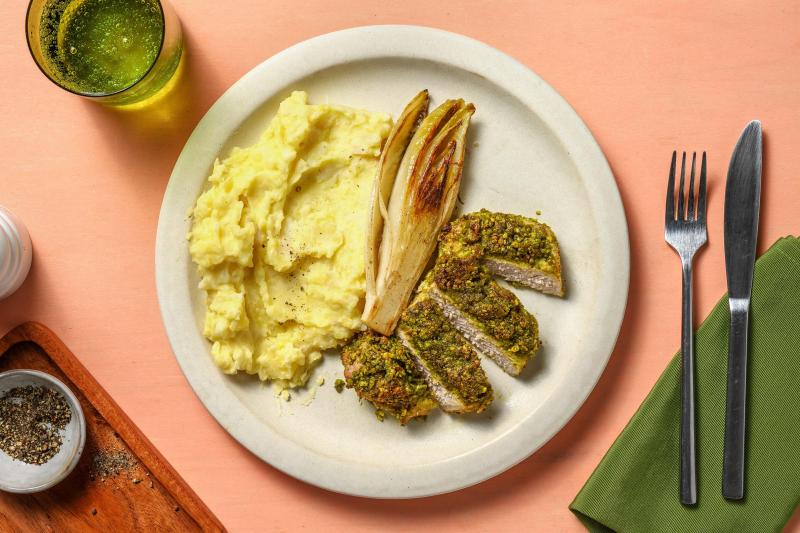 6 Snijd de varkenshaas in plakken. Verdeel de puree en de varkenshaas over de borden. Serveer met het gekaramelliseerde witloof. Garneer met het apart gehouden pistachemengsel.