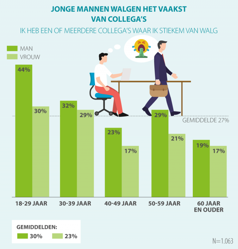 Uit het onderzoek blijkt dat vooral slonzige collega’s schuldig zijn aan de bedenkelijke hygiënische staat waarin veel werkplekken verkeren. Zo zegt maar liefst 26 % van alle werkende Nederlanders dat hun collega’s de werkvloer over het algemeen slecht schoonhouden. Erg opvallend is daarbij het verschil tussen mannen (28 %) en vrouwen (23 %). Ongeacht of ze de werkplek vervuilen, stelt niet minder dan 30 % van de respondenten dat hun collega’s minder hygiënisch zijn dan zijzelf. Wederom zijn mannen minder te spreken over hun ambtgenoten dan vrouwen: 33 % tegenover slechts 26 %. «Wie ruimt de lunchtafel op, wie maakt de lavabo schoon en wie ruimt de vaatwasser in? In de eerste weken na de lockdown hadden we binnen ons bedrijf hierover geen duidelijke afspraken gemaakt. Dat betekent in de praktijk dat dezelfde mensen iedere dag staan te poetsen, terwijl de rest wegloopt zonder op te ruimen. Onderling zorgde dit voor veel spanning. Sinds we duidelijke afspraken hebben gemaakt, is het gelukkig gedaan met profiteren», weet Franke.